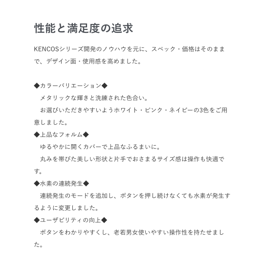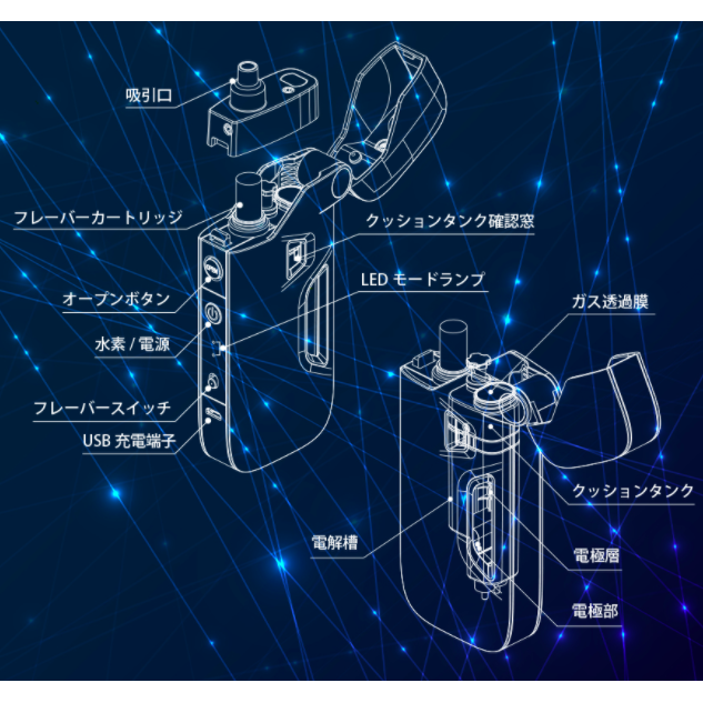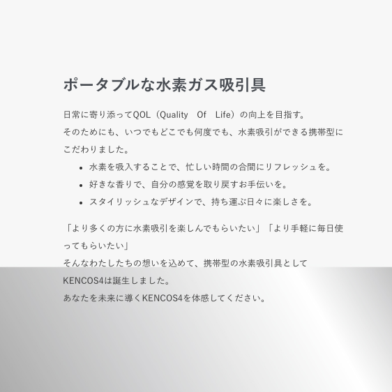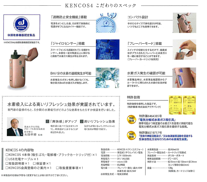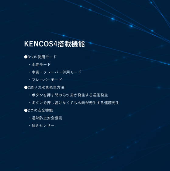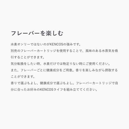 さらに、KENCOS専用のフレーバーカートリッジを使用することで、「吸う」感覚と「テイスト・香り・健康成分」がプラスされ、ワンランクアップした水素吸引を楽しめます。