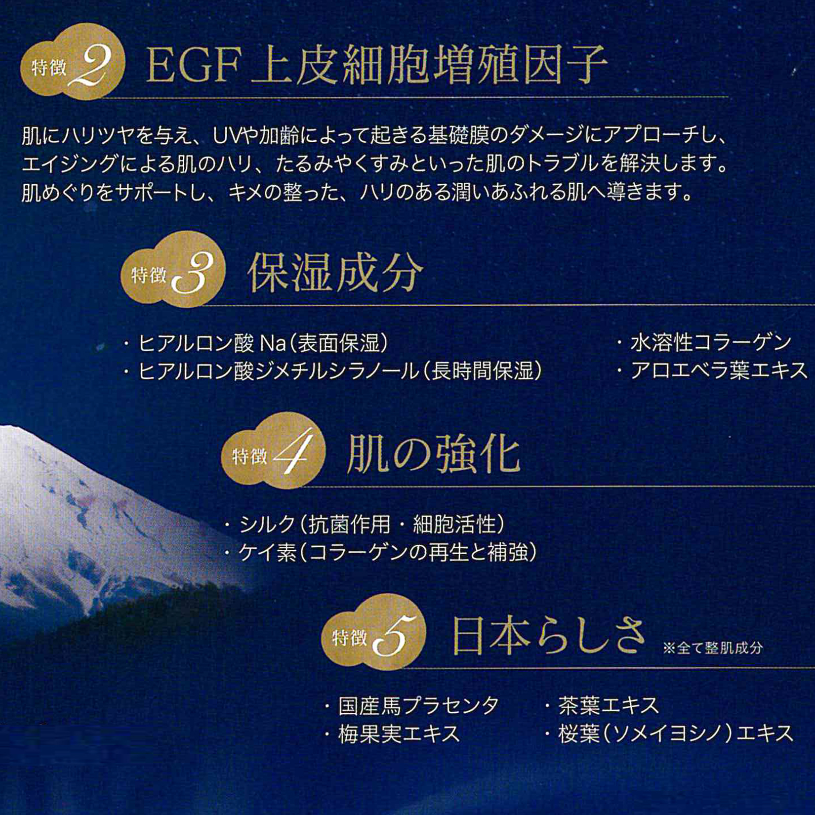 お肌の強化にシルク・ケイ素を配合し、さらに整肌成分として日本ならではの国産馬プラセンタ・梅果実エキス・茶葉エキス・桜葉(ソメイヨシノ)エキスを配合しています。