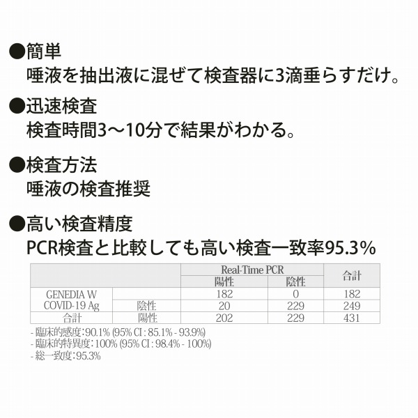 このGCMS抗原検査キットは従来の検査キットと違い、PCR検査とほぼ変わらない検査結果を出せることが特徴で、その一致率は95.3%ととても高精度です。